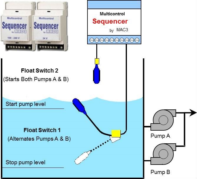This device, by the use of a either a pressure or level switch inserted in the circuit, permits the control and sequencing of 2 pumps .